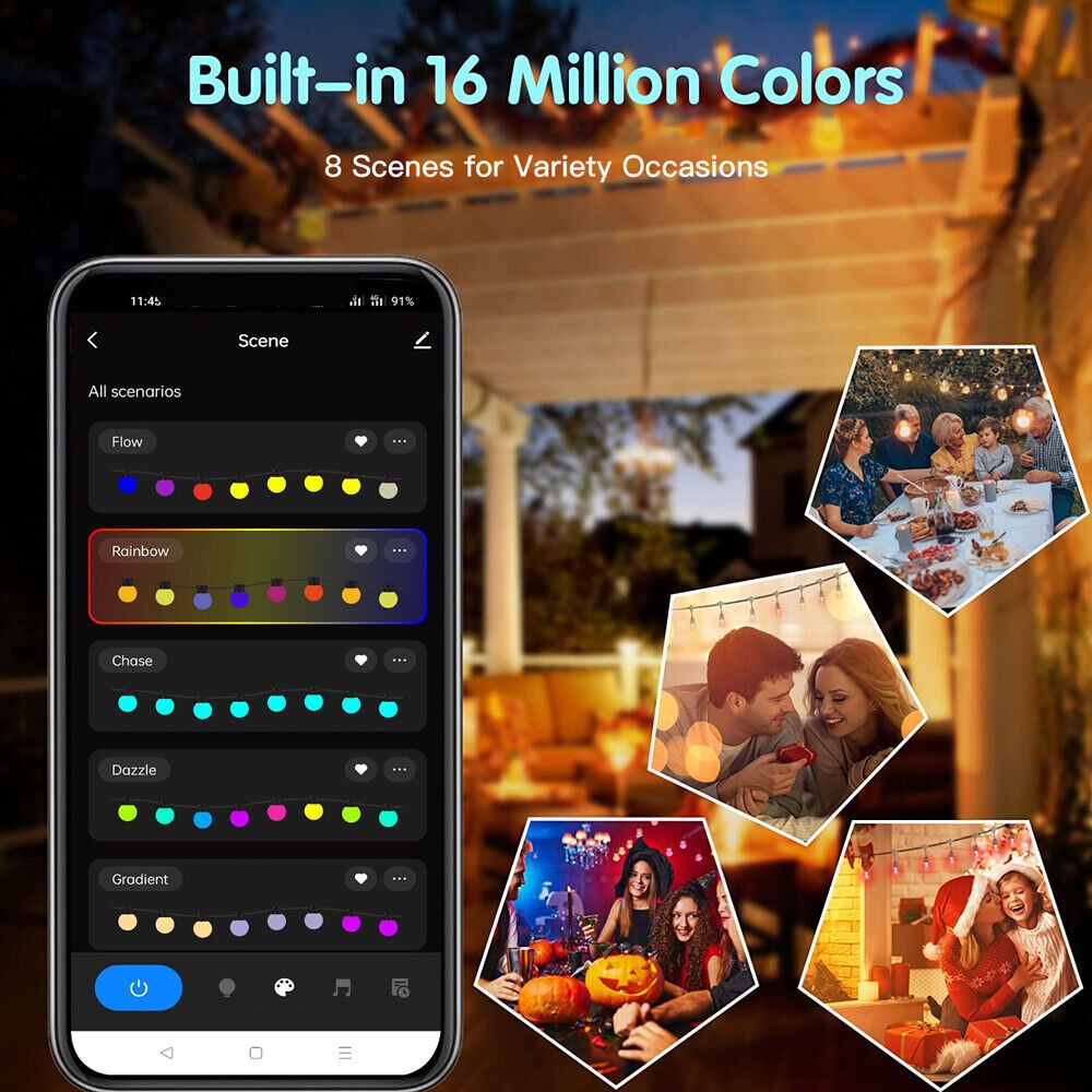 ?Connectable Festoon Lights--- Up to extend connect 3 string lights kits together (Each set 15M/48ft) by Male-Female connector, and up to control 45 Bulbs via WiFi App directly, no need to pair again; Ideal for patio, deck, backyard fence, pergola, porch, bistro, cafe.