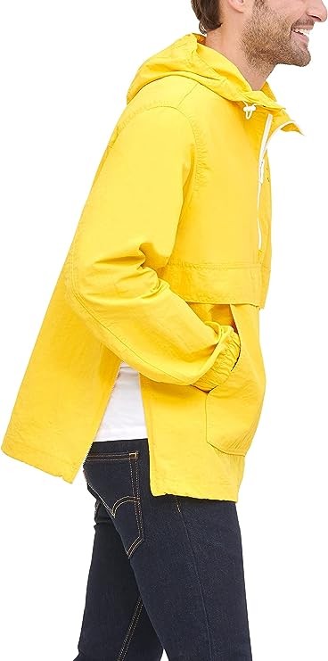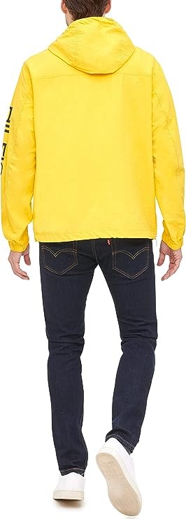 Retro half zip hooded popover jacket in a lightweight taslan nylon with a half zip center front closure, drawstring hood and waistband, elastic cuffs, zipper vent detail on right side seam, Hilfiger logo screen-print down left sleeve, classic tommy flag logo embroidery on left chest and one lower center patch pocket with dual side entry.
