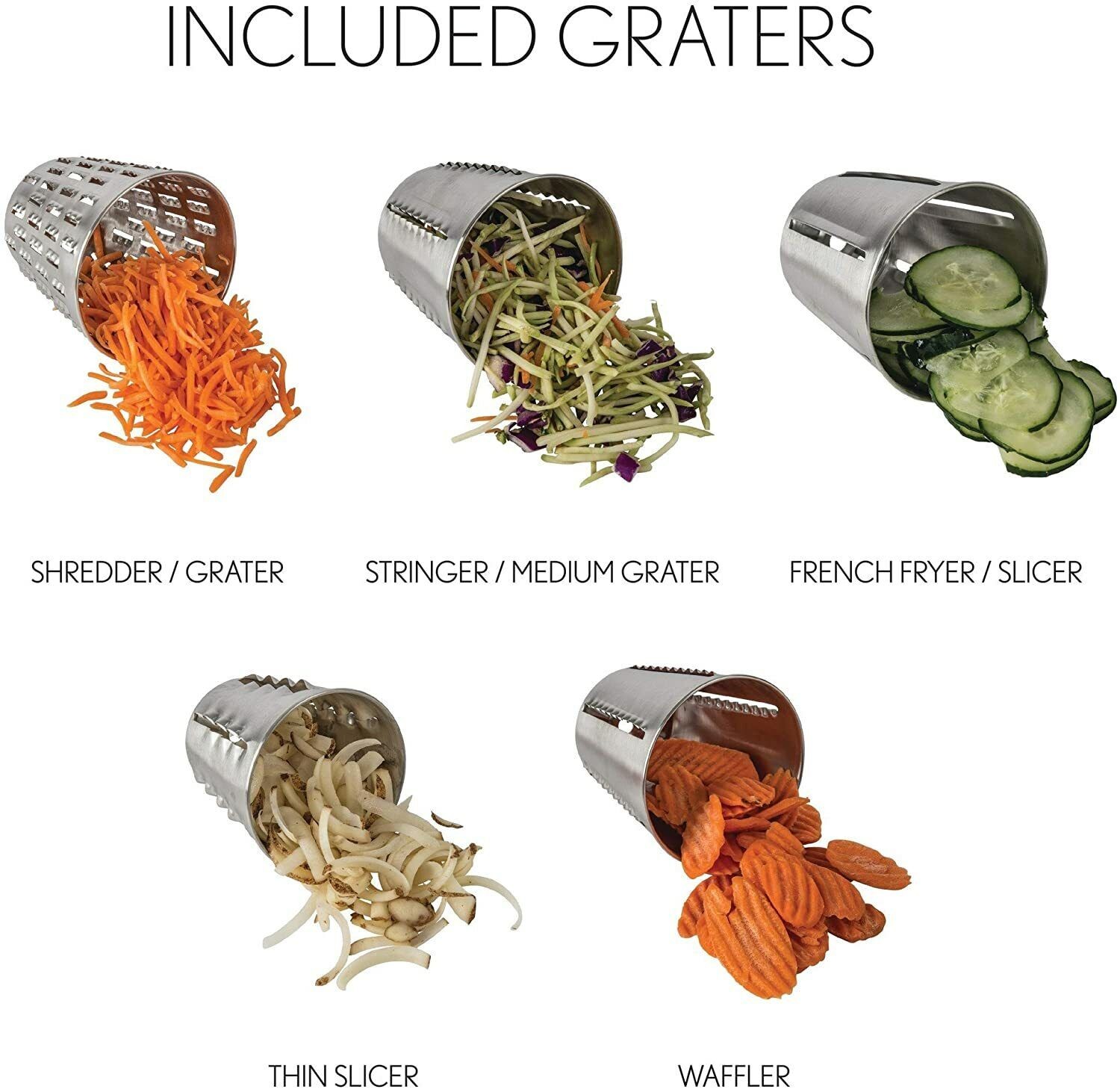 1. Come with 5 different drums blades, which is great for cheese, vegetables, potatoes, nuts, onions, salad, pizza toppings and more.
