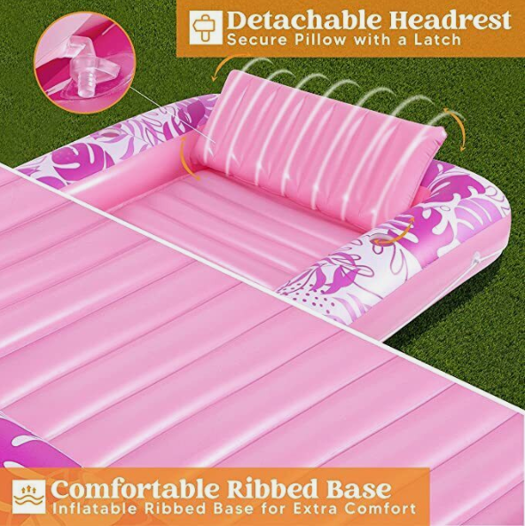 INCLUDES. Packaged includes one 85” x 57” extra large inflatable suntan pool float featured with Inflatable base for extra comfort, two 3”drink holders, one removable headrest, wrap around rope