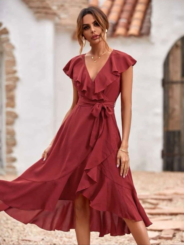 Solid Ruffle Trim Belted Wrap Dress